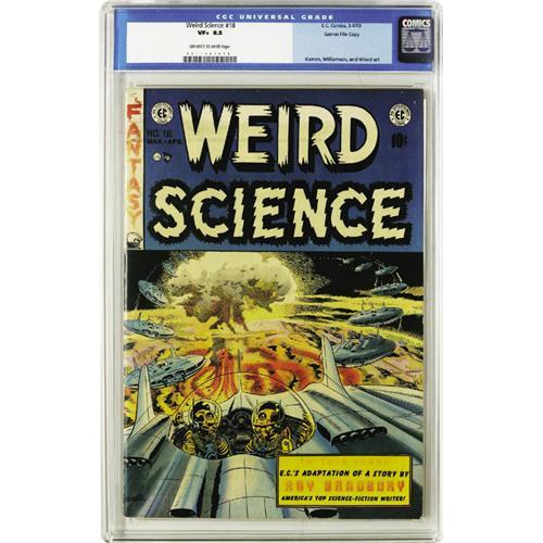 <B>Weird Science #18 Gaines File pedigree 2/12 (EC, 1953) CGC VF+ 8.5 Off-white to white pages.</B></I> "Mars is Heaven," one of EC's best Ray Bradbury adaptations, is featured in this issue. Wally Wood, Al Williamson, Jack Kamen, and Joe Orlando all contribute story art. This issue's cover was printed with an unstable magenta ink, resulting in a fading of the red colors on most existing copies (including this one, from publisher Bill Gaines' collection). As a result, to date only one copy (in 9.2) has been certified by CGC higher than this example. Overstreet 2006 VF 8.0 value = $279; VF/NM 9.0 value = $420. CGC census 5/06: 3 in 8.5, 1 higher. <BR><BR><B>Important notice:</B> Heritage usually auctions material at the rate of 200-250 lots per hour. On some occasions eBay Live bid software or the Internet may not be able to keep up with the pace of the auction. We recommend placing a realistic absentee bid now as insurance to avoid disappointment. Occasionally the auctioneer may eliminate or reject an eBay Live bid, and the auctioneer may also reopen a lot after the close of the eBay live bidding (usually because we missed an audience bid), and may reject your bid even if it shows you as the winning bidder. By bidding via eBay Live, you agree that Heritage may award the lot to another bidder at its sole discretion under the circumstances described above or any other reasonable circumstances. Since eBay bids are not shown to us until we open the lot on the floor, we treat those bids just like floor bids. In most cases the floor responds before the eBay bid is presented to us, due to Internet lag time, so for consistency we have made it a policy that floor bids are always considered first over tie eBay live bids. Also please note that all Heritage lots purchased through eBay Live carry a 22.5% Buyer's Premium. Please make sure you read the Terms and Conditions before you bid. This lot is being auctioned in conjunction with a live floor auction by Heritage Auction Galleries. All final auction and invoice information will be supplied by Heritage Auction Galleries, and all other information should be considered preliminary. Lot:41001 <BR><BR><B>Winning Notification and Billing:</B> After the FINAL session in this auction is complete, Heritage will send e-mail and snail mail invoices. This process normally takes several days. All final auction and invoice information will be supplied by Heritage Auction Galleries, and all other information should be considered preliminary. <BR><BR>This auction will be conducted on a live auction floor and over the Internet through eBay Live. If you choose to place an absentee bid, please take a moment to <font color='#0000ff'><u><a href='http://pages.ebay.com/liveauctions/help/before/laabsentee.html'>learn how eBay Live absentee bidding works</a></u></font><font color='#000000'>