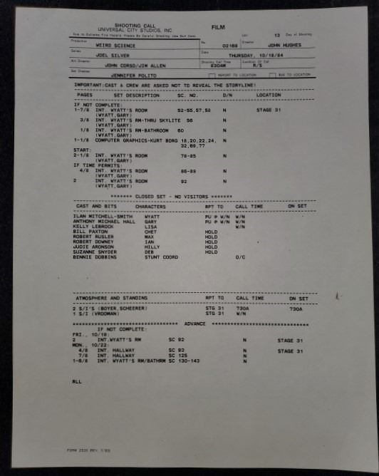 Weird Science (1985) - Call Sheet Oct. 18th 1984.