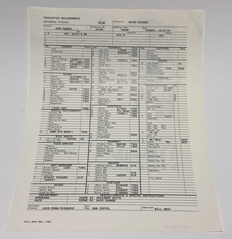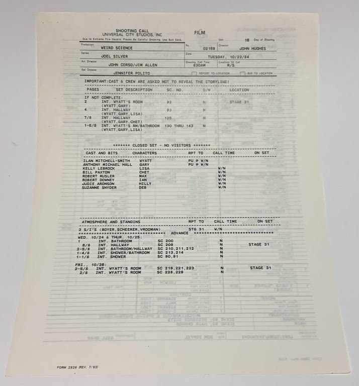 Original production used call-sheet for the John Hughes directed teen science fiction comedy film 'Weird Science' (1985), where two high school nerds use a computer program to literally create the perfect woman, but she turns their lives upside down.