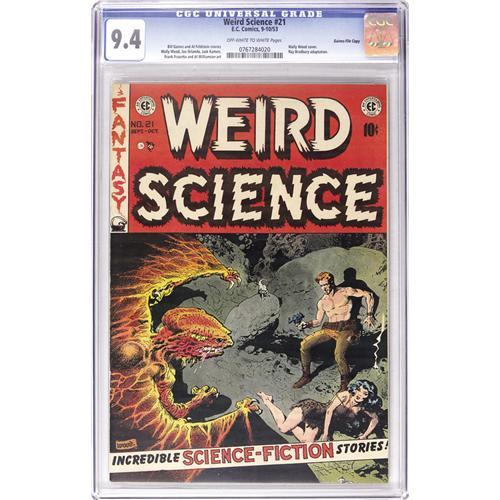 <B>Weird Science #21 Gaines File pedigree 5/11 (EC, 1953) CGC NM 9.4 Off-white to white pages.</B></I> With no 9.8 copies and just one 9.6 on CGC's census as of this writing, this is one of the best copies you're going to find of this issue. The Wally Wood cover should be the deal-sealer, but if even <I>that</B></I> hasn't convinced you, we'll note that Al Williamson and Frank Frazetta teamed up for this issue's story "Two's Company." Overstreet 2006 NM- 9.2 value = $710. CGC census 5/06: 4 in 9.4, 1 higher. <BR><BR><B>Important notice:</B> Heritage usually auctions material at the rate of 200-250 lots per hour. On some occasions eBay Live bid software or the Internet may not be able to keep up with the pace of the auction. We recommend placing a realistic absentee bid now as insurance to avoid disappointment. Occasionally the auctioneer may eliminate or reject an eBay Live bid, and the auctioneer may also reopen a lot after the close of the eBay live bidding (usually because we missed an audience bid), and may reject your bid even if it shows you as the winning bidder. By bidding via eBay Live, you agree that Heritage may award the lot to another bidder at its sole discretion under the circumstances described above or any other reasonable circumstances. Since eBay bids are not shown to us until we open the lot on the floor, we treat those bids just like floor bids. In most cases the floor responds before the eBay bid is presented to us, due to Internet lag time, so for consistency we have made it a policy that floor bids are always considered first over tie eBay live bids. Also please note that all Heritage lots purchased through eBay Live carry a 22.5% Buyer's Premium. Please make sure you read the Terms and Conditions before you bid. This lot is being auctioned in conjunction with a live floor auction by Heritage Auction Galleries. All final auction and invoice information will be supplied by Heritage Auction Galleries, and all other information should be considered preliminary. Lot:41001 <BR><BR><B>Winning Notification and Billing:</B> After the FINAL session in this auction is complete, Heritage will send e-mail and snail mail invoices. This process normally takes several days. All final auction and invoice information will be supplied by Heritage Auction Galleries, and all other information should be considered preliminary. <BR><BR>This auction will be conducted on a live auction floor and over the Internet through eBay Live. If you choose to place an absentee bid, please take a moment to <font color='#0000ff'><u><a href='http://pages.ebay.com/liveauctions/help/before/laabsentee.html'>learn how eBay Live absentee bidding works</a></u></font><font color='#000000'>