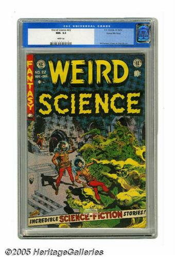 <B>Weird Science #22 Gaines File pedigree (EC, 1953) CGC NM- 9.2 White pages.</B></I> With Wally Wood working on the cover, and Al Williamson (with help from Frank Frazetta and Roy Krenkel), George Evans, and Joe Orlando working on the interior story art, this issue stood out even among EC comic books. At NM- 9.2, this copy just misses tying for the highest-graded copy of #22 yet certified by CGC. While CGC has certified this as a Gaines File copy, no certificate accompanies the lot. Overstreet 2005 NM- 9.2 value = $665. CGC census 7/05: 2 in 9.2, 2 higher.