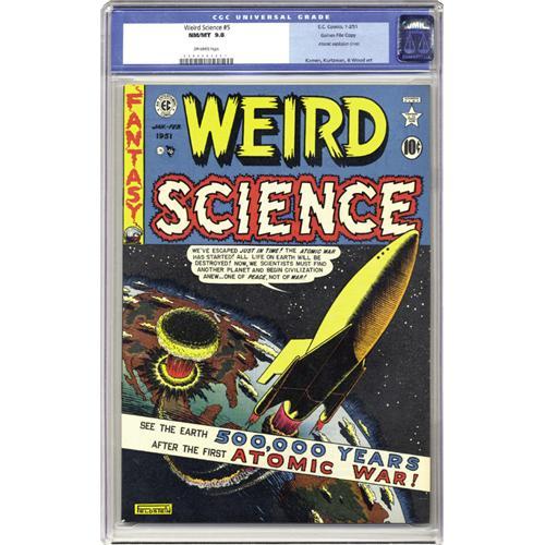 <B>Weird Science #5 Gaines File pedigree (EC, 1951) CGC NM/MT 9.8 Off-white pages.</B></I> Al Feldstein's atomic explosion cover set the tone for this issue, which had two cautionary anti-war tales drawn by Wally Wood and Harvey Kurtzman, respectively. In a somewhat lighter vein, the other two stories, drawn by Al Feldstein and Jack Kamen, are imaginative looks at time travel. By the way, unless you have a time machine of your own that you can set to 1951, you're not going to find a nicer copy than this one. Note that while CGC has certified this book as a Gaines File Copy, no certificate accompanies this lot. Overstreet 2006 NM- 9.2 value = $920. CGC census 5/06: 5 in 9.8, none higher. <BR><BR><B>Important notice:</B> Heritage usually auctions material at the rate of 200-250 lots per hour. On some occasions eBay Live bid software or the Internet may not be able to keep up with the pace of the auction. We recommend placing a realistic absentee bid now as insurance to avoid disappointment. Occasionally the auctioneer may eliminate or reject an eBay Live bid, and the auctioneer may also reopen a lot after the close of the eBay live bidding (usually because we missed an audience bid), and may reject your bid even if it shows you as the winning bidder. By bidding via eBay Live, you agree that Heritage may award the lot to another bidder at its sole discretion under the circumstances described above or any other reasonable circumstances. Since eBay bids are not shown to us until we open the lot on the floor, we treat those bids just like floor bids. In most cases the floor responds before the eBay bid is presented to us, due to Internet lag time, so for consistency we have made it a policy that floor bids are always considered first over tie eBay live bids. Also please note that all Heritage lots purchased through eBay Live carry a 22.5% Buyer's Premium. Please make sure you read the Terms and Conditions before you bid. This lot is being auctioned in conjunction with a live floor auction by Heritage Auction Galleries. All final auction and invoice information will be supplied by Heritage Auction Galleries, and all other information should be considered preliminary. Lot:41001 <BR><BR><B>Winning Notification and Billing:</B> After the FINAL session in this auction is complete, Heritage will send e-mail and snail mail invoices. This process normally takes several days. All final auction and invoice information will be supplied by Heritage Auction Galleries, and all other information should be considered preliminary. <BR><BR>This auction will be conducted on a live auction floor and over the Internet through eBay Live. If you choose to place an absentee bid, please take a moment to <font color='#0000ff'><u><a href='http://pages.ebay.com/liveauctions/help/before/laabsentee.html'>learn how eBay Live absentee bidding works</a></u></font><font color='#000000'>
