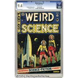 <B>Weird Science #7 (EC, 1951) CGC NM 9.4 Off-white pages.</B></I> This Al Feldstein cover gives us a taste of what fashionable space explorers will wear when manned space flights reach other worlds. The interior has more Feldstein art, plus stories illustrated by Jack Kamen, Wally Wood, and Harvey Kurtzman. This copy is in phenomenal condition, and it's not even a Gaines File Copy! This is currently the second highest CGC-certified grade for this issue. Overstreet 2004 NM- 9.2 value = $660. <BR><BR><B>Important notice:</B> Heritage usually auctions material at the rate of 200-250 lots per hour. On some occasions eBay Live bid software or the Internet may not be able to keep up with the pace of the auction. We recommend placing a realistic absentee bid now as insurance to avoid disappointment. Occasionally the auctioneer may eliminate or reject an eBay Live bid, and the auctioneer may also reopen a lot after the close of the eBay live bidding (usually because we missed an audience bid), and may reject your bid even if it shows you as the winning bidder. By bidding via eBay Live, you agree that Heritage may award the lot to another bidder at its sole discretion under the circumstances described above or any other reasonable circumstances. Since eBay bids are not shown to us until we open the lot on the floor, we treat those bids just like floor bids. In most cases the floor responds before the eBay bid is presented to us, due to Internet lag time, so for consistency we have made it a policy that floor bids are always considered first over tie eBay live bids. Also please note that all Heritage lots purchased through eBay Live carry a 20% Buyer's Premium. Please make sure you read the Terms and Conditions before you bid. </span></font></tr></table></td></tr></table>