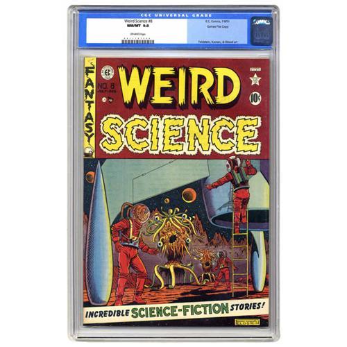 <B>Weird Science #8 Gaines File pedigree 2/12 (EC, 1951) CGC NM/MT 9.8 Off-white pages.</B></I> Here's an out-of-this-world copy of this outer-space comic book. Remember John Hurt's "stomach ache" in the movie "Alien"? Well, you can thrill to the exact same scene in Al Feldstein's cover story, drawn a quarter-century before that movie hit the screens. Where <I>do</B></I> these screenwriters get all their ideas? Other highlights here are the cover by Feldstein and interior art by George Roussos, Jack Kamen, and Wally Wood. Overstreet 2005 NM- 9.2 value = $695. CGC census 12/05: 3 in 9.8, none higher.