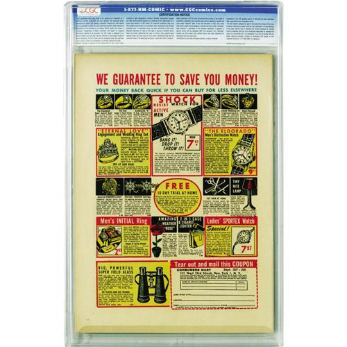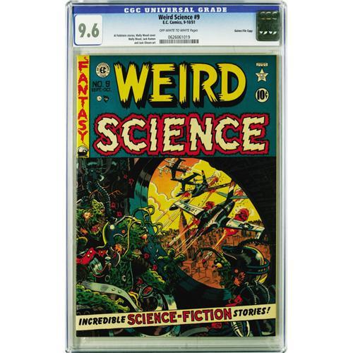 <B>Weird Science #9 Gaine File pedigree 9/12 (EC, 1951) CGC NM+ 9.6 Off-white to white pages.</B></I> Wally Wood's first cover for EC was just as impressive as the classic covers from Al Feldstein that preceded it. He also contributed art for two stories in this issue, and Jack Kamen did another. There isn't a higher-graded copy out there of issue #9 at this writing. Overstreet 2006 NM- 9.2 value = $750. CGC census 3/06: 5 in 9.6, none higher.
