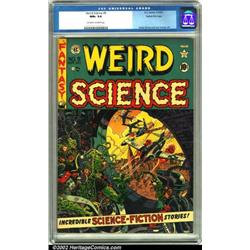 Weird Science #9 Gaines File pedigree 9/12 (EC, 1951). The aliens look like they could be in real trouble in this issue. Wally Wood and Jack Kamen did the cover and interior art. Perfectly flat with super sharp corners and intense cover gloss, this issue, according to CGC, is the nicest copy they've seen. CGC NM+ 9.6 Off-white to white pages. Overstreet 2001 NM 9.4 value = $485. Important notice: We expect to be auctioning lots at the rate of 200-250 per hour. Sometimes eBay Premier live bid software cannot keep up with that pace, so we strongly recommend that you place a realistic proxy bid now as insurance to avoid disappointment. Also please note that all Heritage/CAA lots purchased through eBay Premier carry a 20% Buyer's Premium.