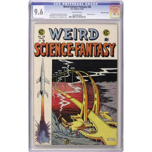 <B>Weird Science-Fantasy #28 Gaines File pedigree 3/12 (EC, 1955) CGC NM+ 9.6 Off-white pages.</B></I> Al Feldstein's cover makes us wonder -- is this Earth in the future, or some strange planet? At any rate, this is a sweet copy of this next-to-last issue (before the title changed to <B>Incredible Science Fiction</B></I>), which also includes an Adam Link story. Wally Wood, Al Williamson, Jack Kamen, and Joe Orlando all contribute interior art. Overstreet 2006 NM- 9.2 value = $525. CGC census 10/06: 2 in 9.6, 1 higher.<BR><BR><b>Shipping:</b> Slabbed Comic (<a target="_blank" href="http://www.heritageauctions.com/common/shipping.php">view shipping information</a>)