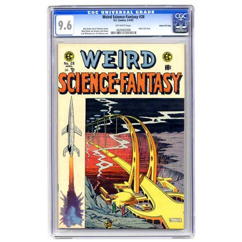 <B>Weird Science-Fantasy #28 Gaines File pedigree 3/12 (EC, 1955) CGC NM+ 9.6 Off-white pages.</B></I> Al Feldstein's cover makes us wonder -- is this Earth in the future, or some strange planet? At any rate, this is a sweet copy of this next-to-last issue (before the title changed to <B>Incredible Science Fiction</B></I>), which also includes an Adam Link story. Wally Wood, Al Williamson, Jack Kamen, and Joe Orlando all contribute interior art. Overstreet 2005 NM- 9.2 value = $490. CGC census 12/05: 2 in 9.6, 1 higher.
