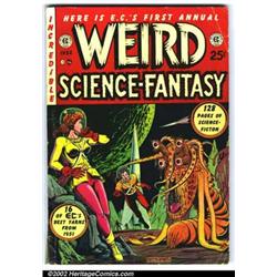 Weird Science-Fantasy Annual #1 (EC, 1952). Wonderful collection of EC SF stories, created from backstock re-bound with a new cover. Outstanding artwork by Wally Wood, Jack Kamen, Al Feldstein, Bernie Krigstein, and more. This copy is in good shape, with some spine wear and creasing, but still has great color. One small spine split has been repaired with tape; small chip out of one interior page, does not affect art. Condition: VG. Overstreet 2001 GD 2.0 value = $164; FN 6.0 value = $491. Important notice: We expect to be auctioning lots at the rate of 200-250 per hour. Sometimes eBay Premier live bid software cannot keep up with that pace, so we strongly recommend that you place a realistic proxy bid now as insurance to avoid disappointment. Also please note that all Heritage/CAA lots purchased through eBay Premier carry a 20% Buyer's Premium.