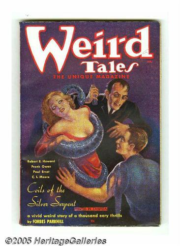 <B>Weird Tales (Pulp) Feb 1936 Canadian Edition (Popular Fiction, 1936) Condition: FN-.</B></I> Attractions like the Margaret Brundage Girl vs. Snake cover, a (reprinted) H. P. Lovecraft story, and a Robert E. Howard Conan the Barbarian serial chapter are normally nice enough, but for this pulp the excitement doesn't end there. This copy is in great condition, and even more interestingly, it's a Canadian variant. The bottom of the front cover notes "Printed in Canada," and, like Canadian-variant comics, the inside front and back covers are blank, instead of featuring the advertisements seen on the Stateside versions. The cover of this pulp is clean, bright, and glossy. The spine is tight and unfaded, with only a half-inch scuff near the bottom on the back edge. The pages are a fresh cream to off-white. Considering the smaller population of Canada, this variant is surely scarce, and this copy may well be the finest surviving example. The Ultimate Guide to the Pulps VG value = $60. <I>From the Collection of Chris Bell</B></I>.