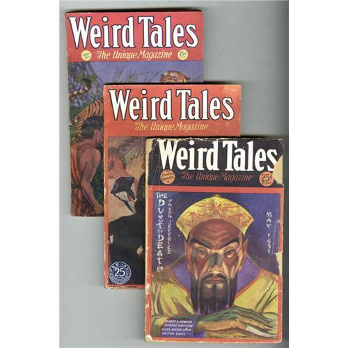 <B>Weird Tales (Pulp) Group (Popular Fiction, 1931).</B></I> This lot consists of the issues from Jan/31 (GD/VG); Feb-Mar/31 (GD, coupon clipped from back cover); Apr-May/31 (GD-, no back cover, front cover detached); July/31 (two copies, GD and VG-); and Dec/31 (GD, covers detached). Notable features include "The Children of the Night" by Robert E. Howard, "The Horror From the Hills" by Frank Belknap Long, and "Tam, Son of the Tiger" by Otis Kline. Approximate Bookery's Guide to the Pulps value for group = $360.