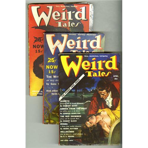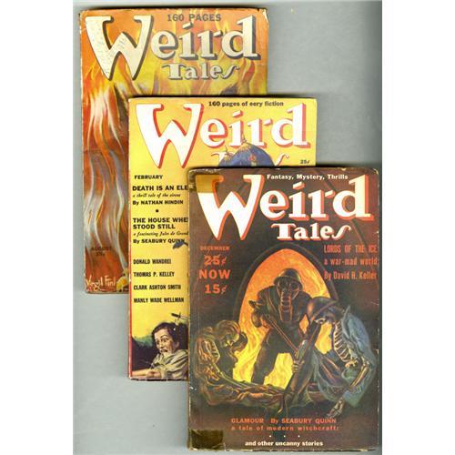 <B>Weird Tales (Pulp) Group (Popular Fiction, 1939).</B></I> This lot consists of issues from Jan/39 (GD); Feb/39 (VG); March/39 (VG); Apr/39 (VG-); May/39 (GD); July/39 (VG); Aug/39 (VG); Sept/39 (Fair, includes "In The Walls of Eryx" story, but married from another copy with each page loose and laminated in plastic); Oct/39 (VG/FN); Nov/39 (Apparent VG, slight color touch); and Dec/39 (GD/VG, first professional cover art by Hannes Bok). Stories by H. P. Lovecraft and Robert E. Howard. Approximate Bookery's Guide to the Pulps value for group = $325.