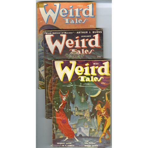 <B>Weird Tales (Pulp) Group (Popular Fiction, 1950-53).</B></I> This lot consists of issues dated Jan/50 (VG+); March/50 (GD-); May/50 (VG); July/50 (two copies, GD and VG); Sept/50 (GD/VG); Nov/50 (Apparent VG, spine replaced, entire cover reinforced with adhesive plastic); and May/53 (GD). Approximate Bookery's Guide to the Pulps value for group = $90.