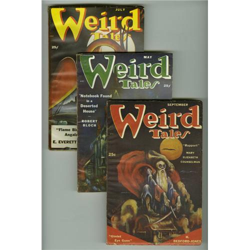 <B>Weird Tales (Pulp) Group (Popular Fiction, 1951).</B></I> This lot consists of issues from Jan/51 (VG); March/51 (Fair); May/51 (VG+); July/51 (VG+, tape on spine); Sept/51 (VG/FN); and Nov/51 (GD). Approximate Bookery's Guide to the Pulps value for group = $75.