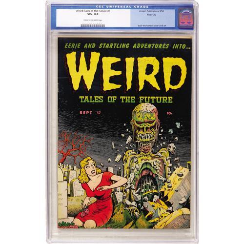 <B>Weird Tales of the Future #3 River City pedigree (Aragon, 1952) CGC VF+ 8.5 Cream to off-white pages.</B></I> Basil Wolverton provided the creepy cover and art for this issue. Wolverton and other horror masters of the day knew that a helpless, beautiful girl helped mitigate our fright. Looking back, why didn't we wonder why such winsome lasses prowled cemeteries at night and all alone? Because it made for a better cover! Overstreet 2006 VF 8.0 value = $869; VF/NM 9.0 value = $1,372. CGC census 3/07: 2 in 8.5, 2 higher.<BR><BR><b>Shipping:</b> Comics - Slabbed (certified) (<a target="_blank" href="http://www.heritageauctions.com/common/shipping.php">view shipping information</a>)