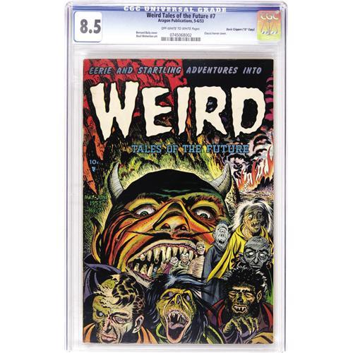 <B>Weird Tales of the Future #7 Davis Crippen ("D" Copy) pedigree (Aragon, 1953) CGC VF+ 8.5 Off-white to white pages.</B></I> One of the all-time great pre-Code horror covers is this Bernard Baily effort! This issue includes the intriguing story "The Mind Movers" with the art to Basil Wolverton's "Brain Bats of Venus" from <B>Mister Mystery</B></I> #7 which was cut apart, pasted up, partially redrawn, and rewritten. Overstreet 2006 VF 8.0 value = $744; VF/NM 9.0 value = $1,172. CGC census 6/06: 2 in 8.5, 2 higher. <I>From the Crippen Collection.</B></I> <BR><BR><B>Important notice:</B> Heritage usually auctions material at the rate of 200-250 lots per hour. On some occasions eBay Live bid software or the Internet may not be able to keep up with the pace of the auction. We recommend placing a realistic absentee bid now as insurance to avoid disappointment. Occasionally the auctioneer may eliminate or reject an eBay Live bid, and the auctioneer may also reopen a lot after the close of the eBay live bidding (usually because we missed an audience bid), and may reject your bid even if it shows you as the winning bidder. By bidding via eBay Live, you agree that Heritage may award the lot to another bidder at its sole discretion under the circumstances described above or any other reasonable circumstances. Since eBay bids are not shown to us until we open the lot on the floor, we treat those bids just like floor bids. In most cases the floor responds before the eBay bid is presented to us, due to Internet lag time, so for consistency we have made it a policy that floor bids are always considered first over tie eBay live bids. Also please note that all Heritage lots purchased through eBay Live carry a 22.5% Buyer's Premium. Please make sure you read the Terms and Conditions before you bid. This lot is being auctioned in conjunction with a live floor auction by Heritage Auction Galleries. All final auction and invoice information will be supplied by Heritage Auction Galleries, and all other information should be considered preliminary. Lot:41001 <BR><BR><B>Winning Notification and Billing:</B> After the FINAL session in this auction is complete, Heritage will send e-mail and snail mail invoices. This process normally takes several days. All final auction and invoice information will be supplied by Heritage Auction Galleries, and all other information should be considered preliminary. <BR><BR>This auction will be conducted on a live auction floor and over the Internet through eBay Live. If you choose to place an absentee bid, please take a moment to <font color='#0000ff'><u><a href='http://pages.ebay.com/liveauctions/help/before/laabsentee.html'>learn how eBay Live absentee bidding works</a></u></font><font color='#000000'>