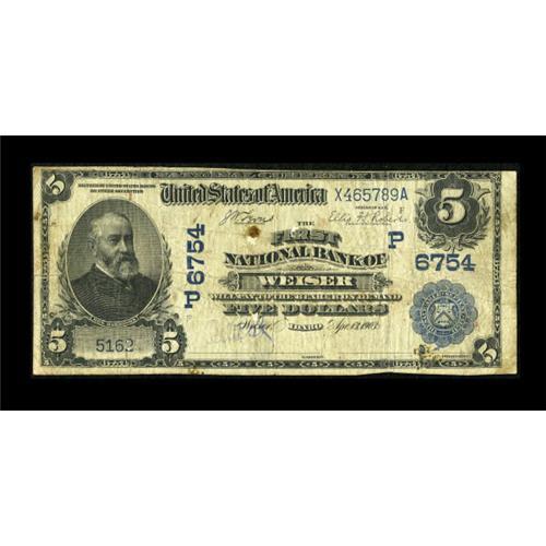 <B>Weiser, ID</B></I> - $5 1902 Date Back Fr. 590 <B>The First NB</B></I> Ch. # (P)6754<BR> This is only $5 Date Back reported to date from this bank, which issued large notes only before disappearing in 1923. <B>Very Good</B></I>, with the signatures faded. A few stains are noticed.<BR><I>From The Kansas City Collection.</B></I><BR><BR><b>Shipping:</b> Coins & Currency (<a target="_blank" href="http://www.heritageauctions.com/common/shipping.php">view shipping information</a>)