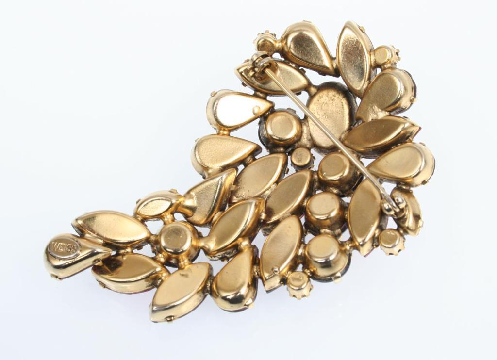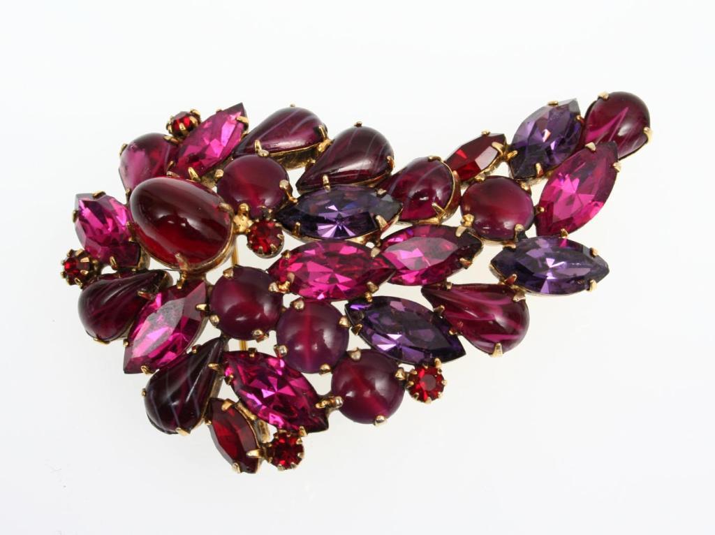 Weiss, set with various shades of red, raspberry, and amethyst toned rhinestones, the verso signed Weiss. 2 3/4" x 1 1/2". Condition: excellent, no damage or repair.