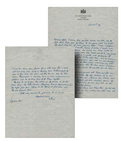 Chaim Weizmann autograph letter signed “Chaim” in English, dated 22 October 1939 upon London's Dorchester Hotel stationery. Reads in part, ''…we shall probably visit both North & South A., also Canada…but of course it is premature to make any plans now with an ever changing crazy world…Michael has already left us; he is somewhere in England…I was very sorry to hear of your illness…one has to keep ones head now with all the horrible troubles in the world…'' Two pages, front and verso, measuring 6'' x 7.75''. Lightly creased, else fine.