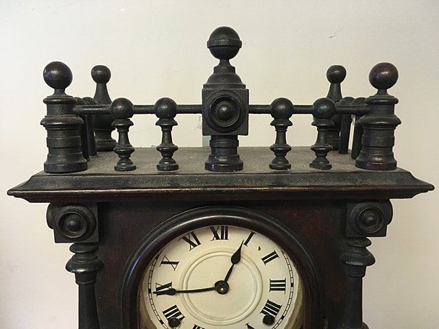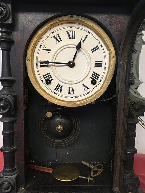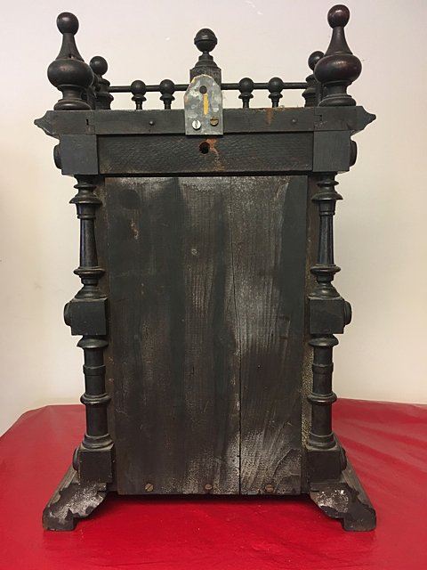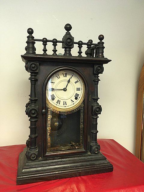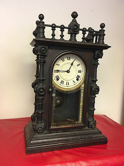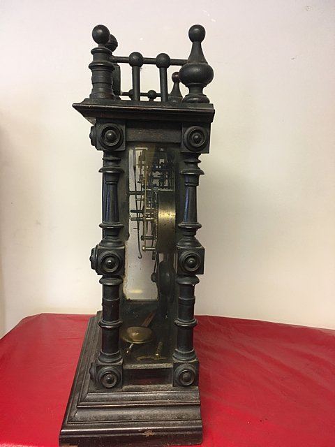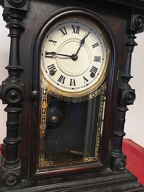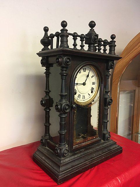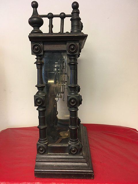 Welch Spring & Co. "Gerster" Clock, c. 1875, eight-day brass spring movement, gold gilt stencil on glass. Renaissance revival influence throughout case, with glass side panels to show movement. Beautiful mantel clock! Measures approx. 18 1/2" tall x 12" wide x 6 1/4" deep.