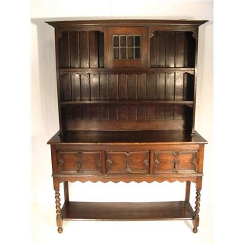 Welch-style step back cupboard constructed of rich oak having center door with opposing shelves to either side and two shelves below resting on a base of two doors centered by a single drawer each having a carved applied molding. The lower case rests on rope turned and balustered front legs with a lower shelf. The form is consistent with many Welch cupboards of the 17th and 18th centuries. This piece is a later English reproduction dating to the latter half of the 19th century. Mellow age to the surface. There is a small repair to the lower left trim of the upper cabinet that is shown in one of the pictures. Repair is using the existing piece glued back in to place and is barely notceable. Otherwise, this piece is in very good overall condition. Very sturdy and ready to use.
