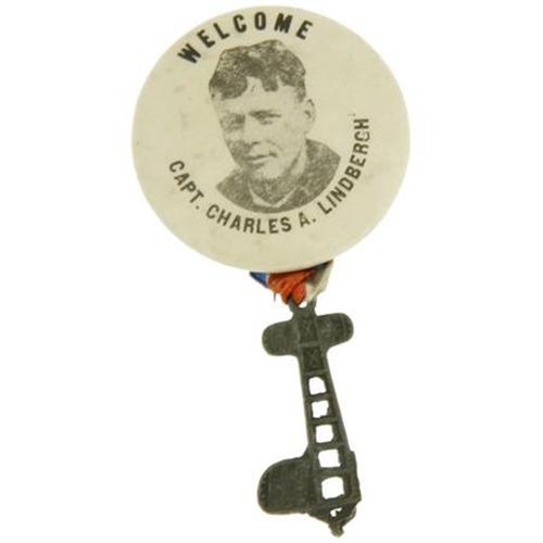 <B>“Welcome Capt. Charles A. Lindbergh” Pinback Button, </B></I>1 ½”, with suspended metal airplane. One wing missing on plane and very light moisture marks, else fine. <B></B></I><BR><BR><b>Shipping:</b> Miscellaneous Collectibles, Smal (<a target="_blank" href="http://www.heritageauctions.com/common/shipping.php">view shipping information</a>)
