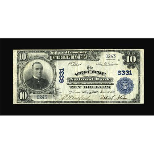 <B>Welcome, MN</B></I> - $10 1902 Plain Back Fr. 624 <B>The Welcome NB</B></I> Ch. # 6331<BR>A nice grade example from this not terribly common bank. Pen signed <B>Very Fine,</B></I> an always sought after note bearing an interesting town name.<BR><BR><b>Shipping:</b> Coins & Currency (<a target="_blank" href="http://www.heritageauctions.com/common/shipping.php">view shipping information</a>)
