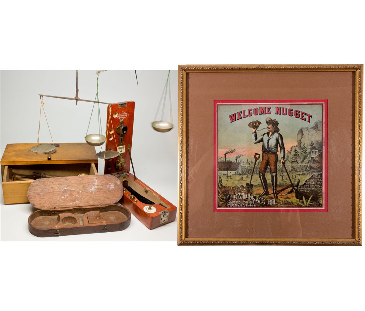 Framed art poster of the "Welcome Nugget," with the prospector holding up the giant gold nugget purported to weigh in at 2217 ounces. The art work was issued by T.C. Williams Co. Manufacturers of Virginia. The image measures 10"x10", the double-matted frame measures 16"x16". Excellent condition. 3 pocket mining scales: folding scale set w/ weights by Abr. Levine of New York. Beautiful wood case with latch mechanism in front. Measures 6.5"x2.5"x1.75". A Henry Troemner (Philadelphia) wooden box folding scale, with brass receiver for scale base on lid, scale pieces fit into drawer below. Coin-like weight set is in round receptacle inside. Measures 8.5"x4"x2.5". Wooden case folding string scale, brass trays and arms, some weights missing. Measures 8"x2.5". -61572