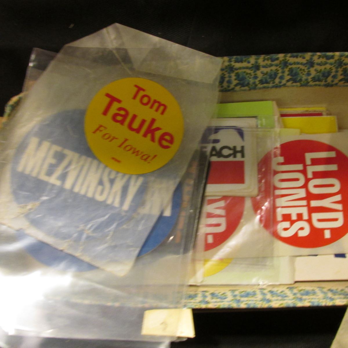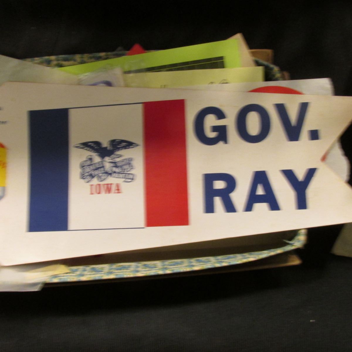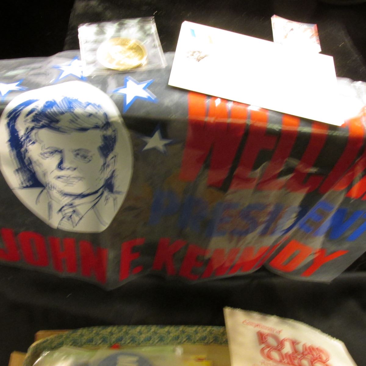 "Welcome President John F.Kennedy" banner; large group of Political memorabilia; "Oct. 12, 1492 "First Landing in the New World", 'Christopher Columbus/1451-1506"; & an Iowa post card autographed in 1946 by Harold E. Hughes, then Governor of Iowa.