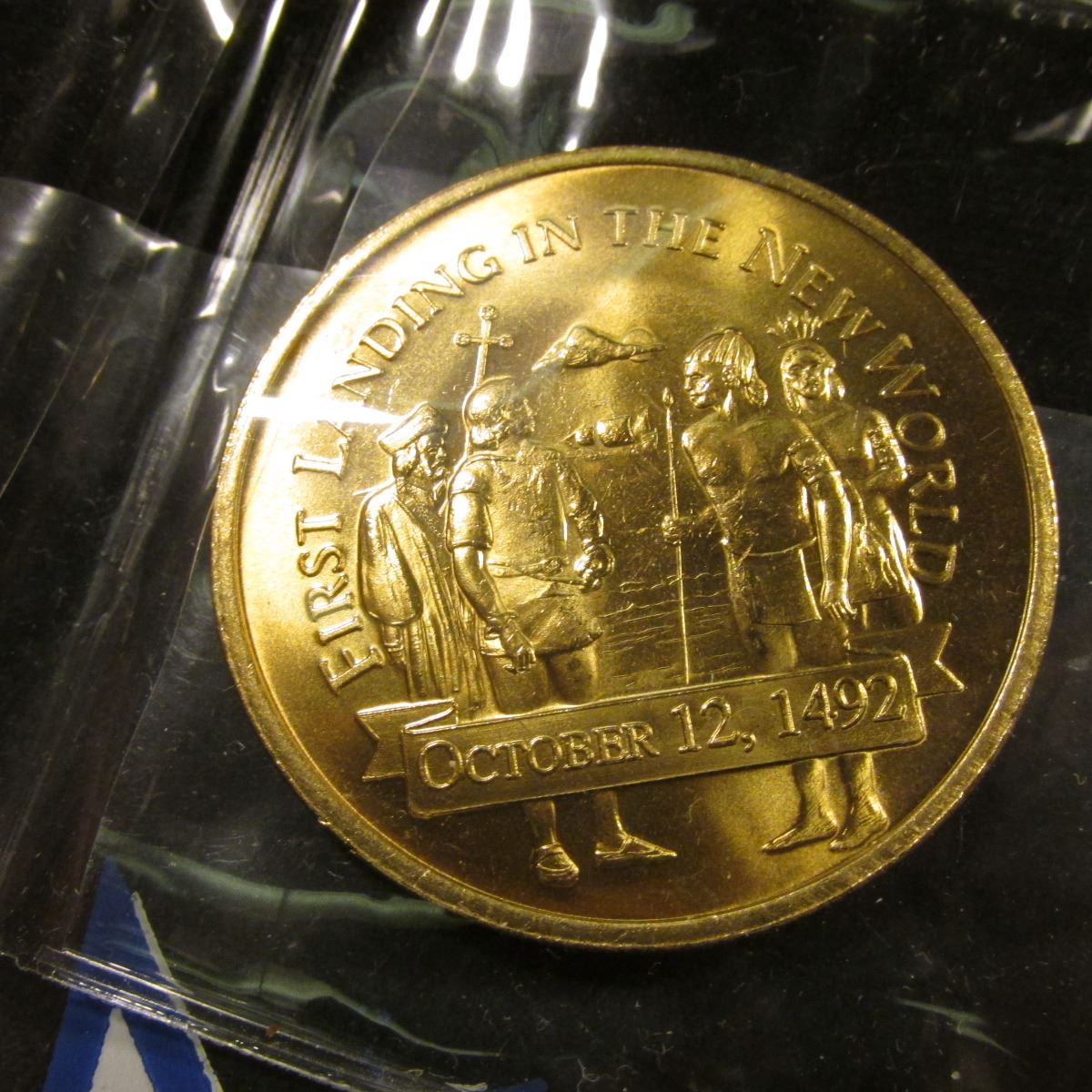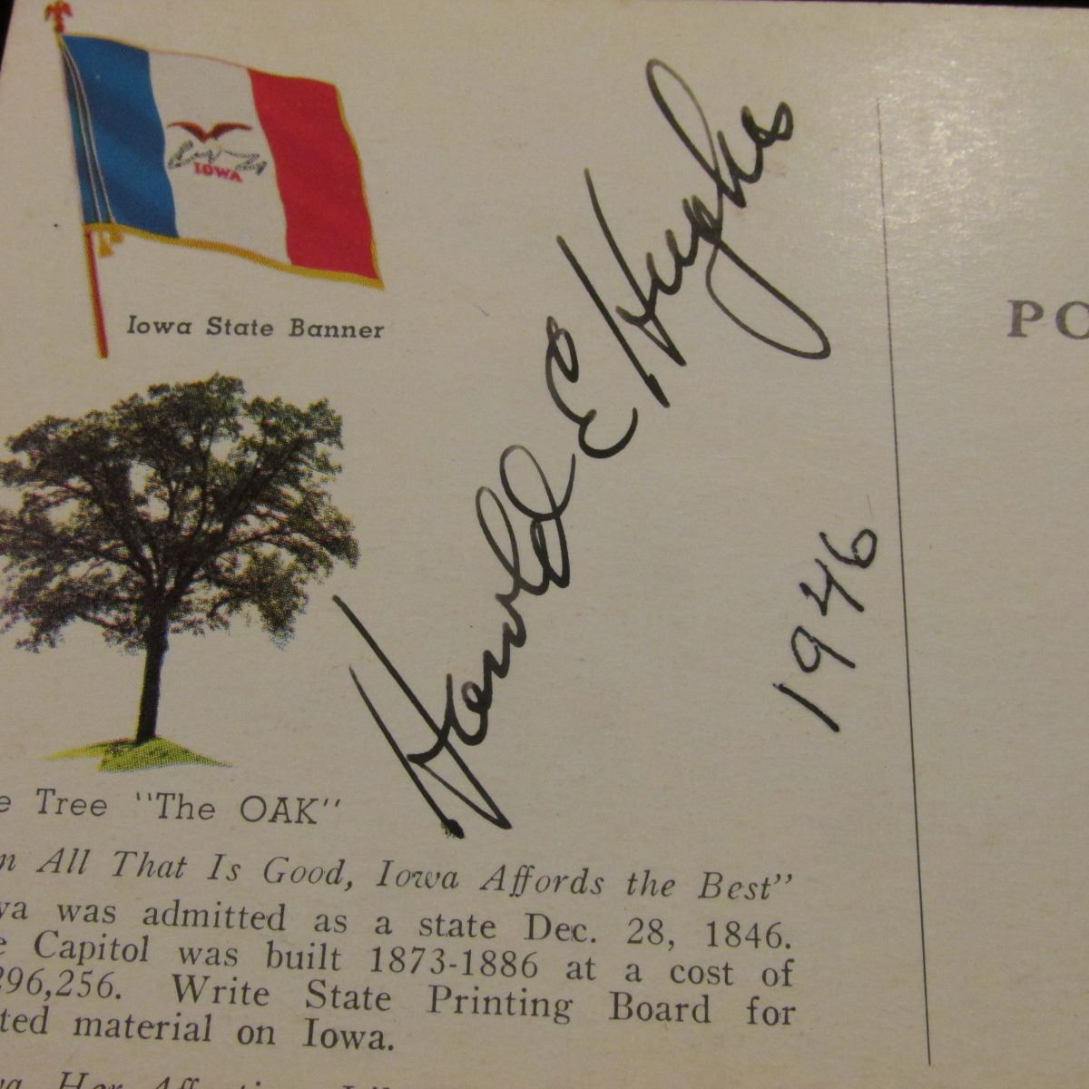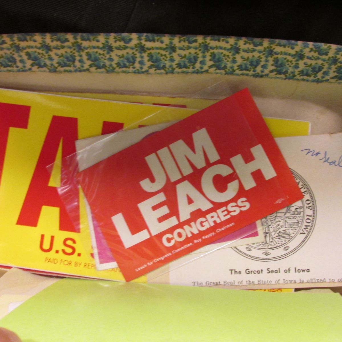 "Welcome President John F.Kennedy" banner; large group of Political memorabilia; "Oct. 12, 1492 "First Landing in the New World", 'Christopher Columbus/1451-1506"; & an Iowa post card autographed in 1946 by Harold E. Hughes, then Governor of Iowa.