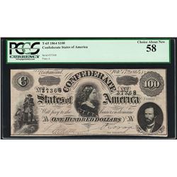1864 $100 Confederate States of America Note T-65 PCGS Choice About New 58