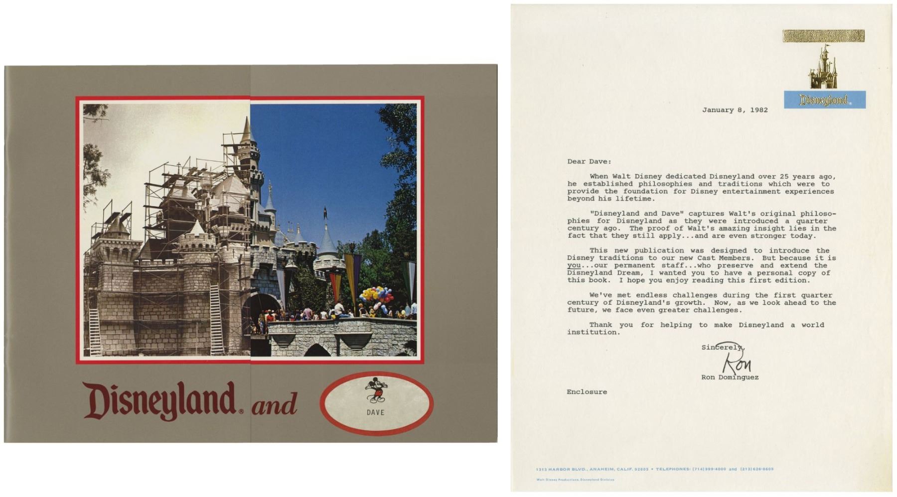 (Disneyland, 1982) A cast member guidebook titled, "Welcome to Disneyland" which was published by Disney University to educate new hires on the policies, practices, and procedures of Disneyland. This booklet displays the original recipient's name on the cover in the bottom-right corner, and a personalized company thank-you letter from Ron Dominguez is enclosed within. This guide contains the original 1955 orientation handbook guidelines, as well as some of Walt's personal philosophies and goals for Disneyland. The 31-page booklet measures 11"x8.5" and is in very good condition.