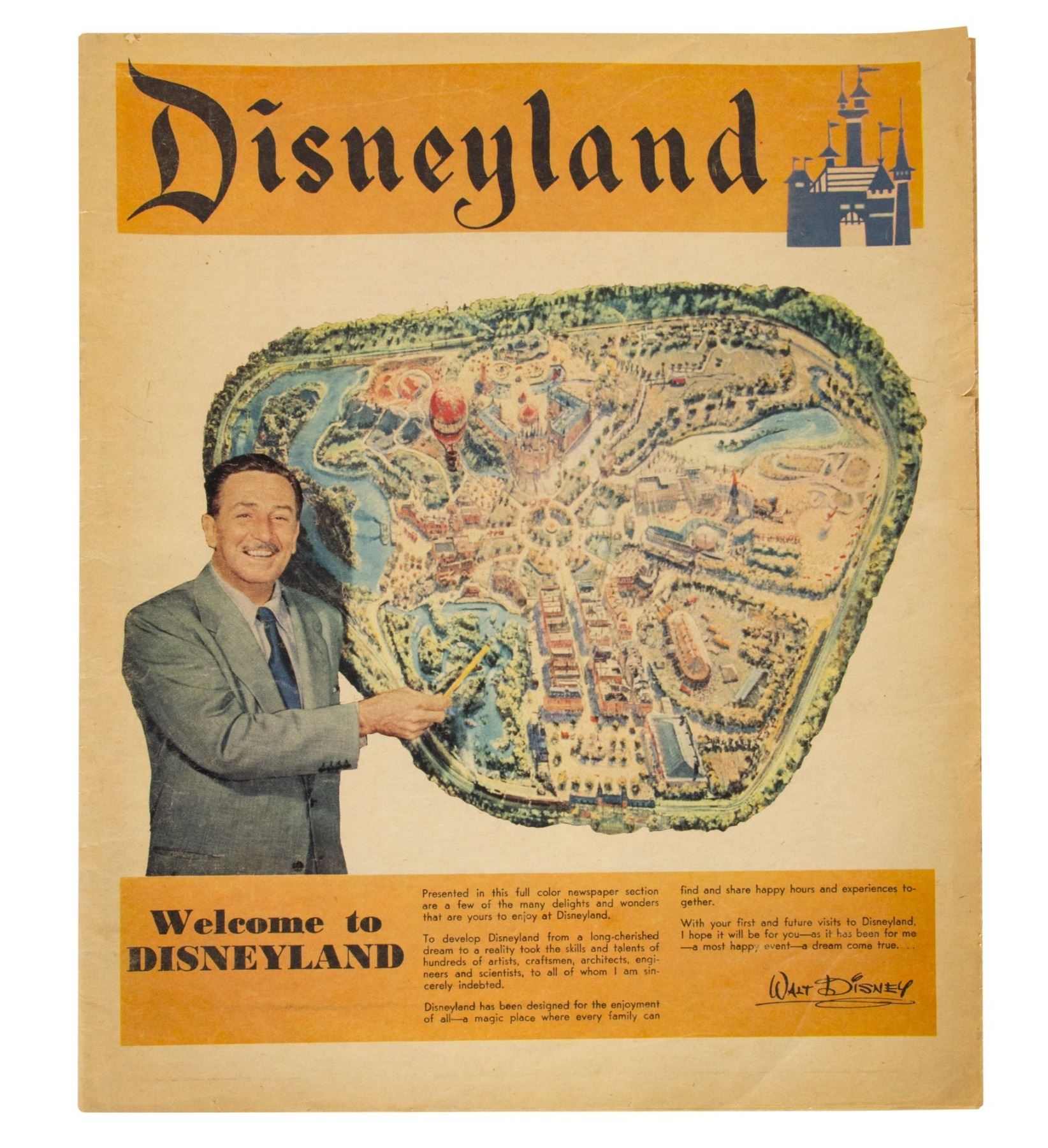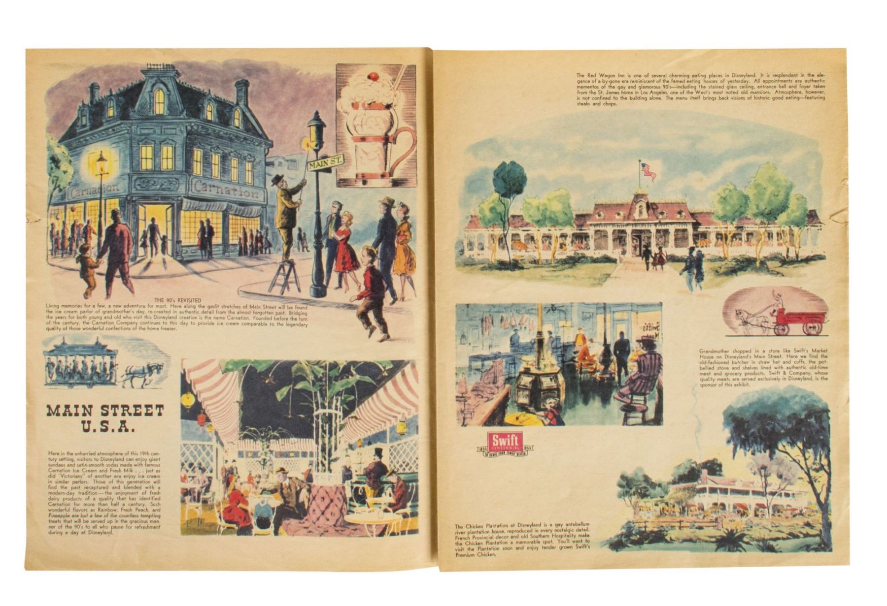 (Disneyland, 1955) This gorgeous 20-page newspaper supplement was issued by California area newspapers just before the Grand Opening of Disneyland in order to promote the new park. Contained inside are beautiful concept art and illustrations that depict some of the lands and attractions that guests would soon be able to enjoy. The supplement measures approximately 10.75"x13.25" and is in good condition with minor creasing and small tears to some of the edges.