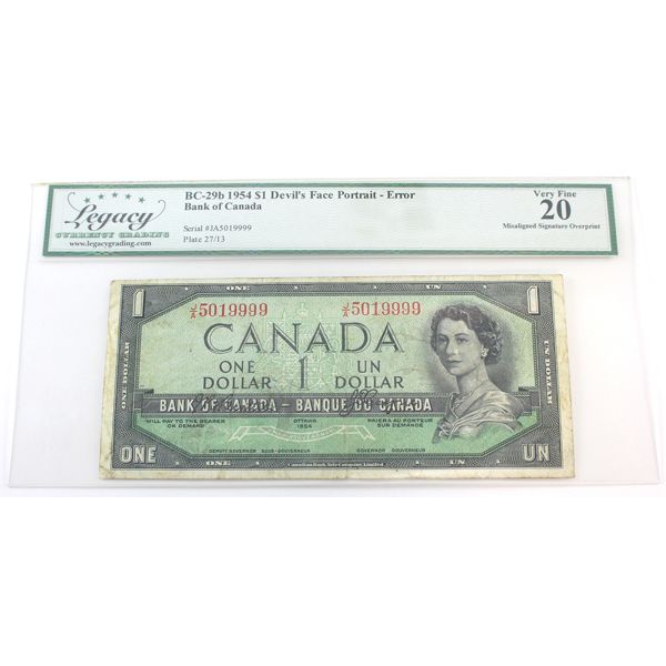 ERROR BC-29b 1954 $1 Devil's Face Legacy VF20 Misaligned Signature Overprint Beattie-Coyne