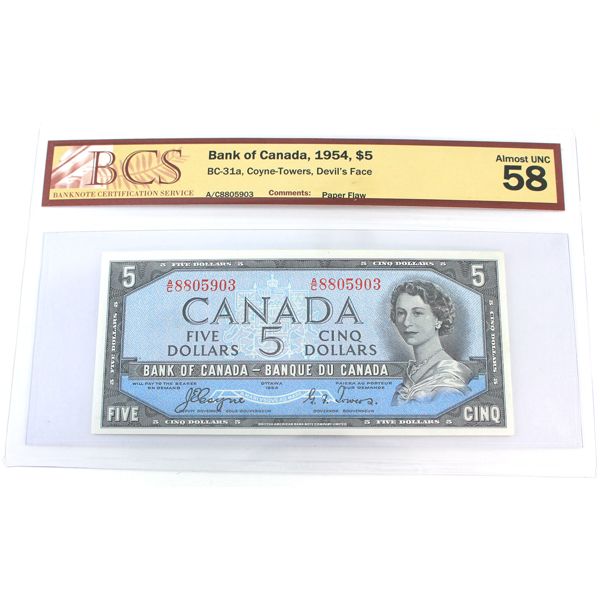 BC-31a 1954 $5 BCS AU58 Coyne-Towers, Devil's Face SN: A/C8805903 (Paper Flaw)