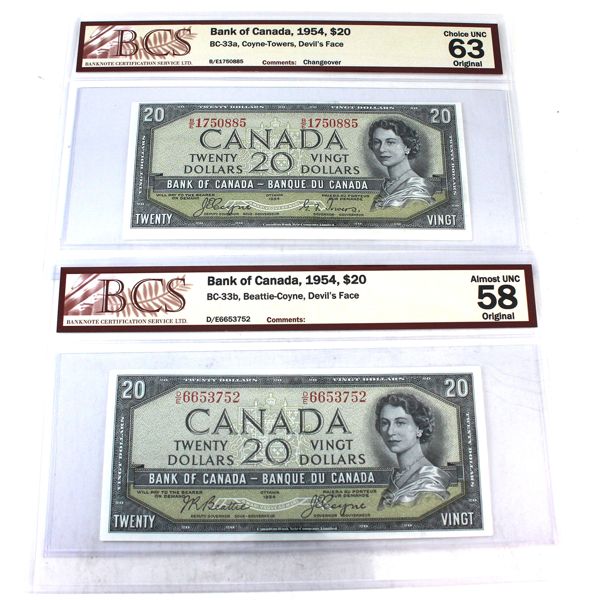 BC-33a & BC-33b 1954 $20 BCS Original Coyne-Towers or Beattie-Coyne Devil's Face Bank Notes. 2pcs.