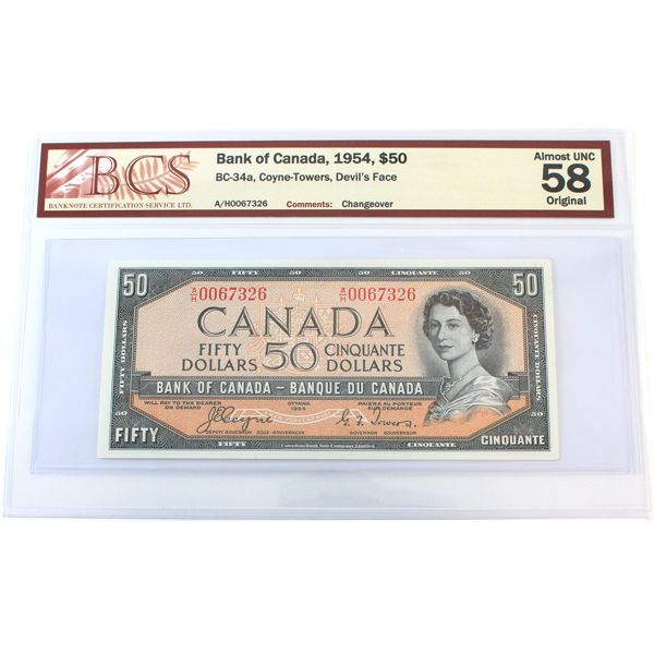 BC-34a 1954 $50 Devil's Face BCS AU58 Original Changeover Coyne-Towers SN: A/H0067326
