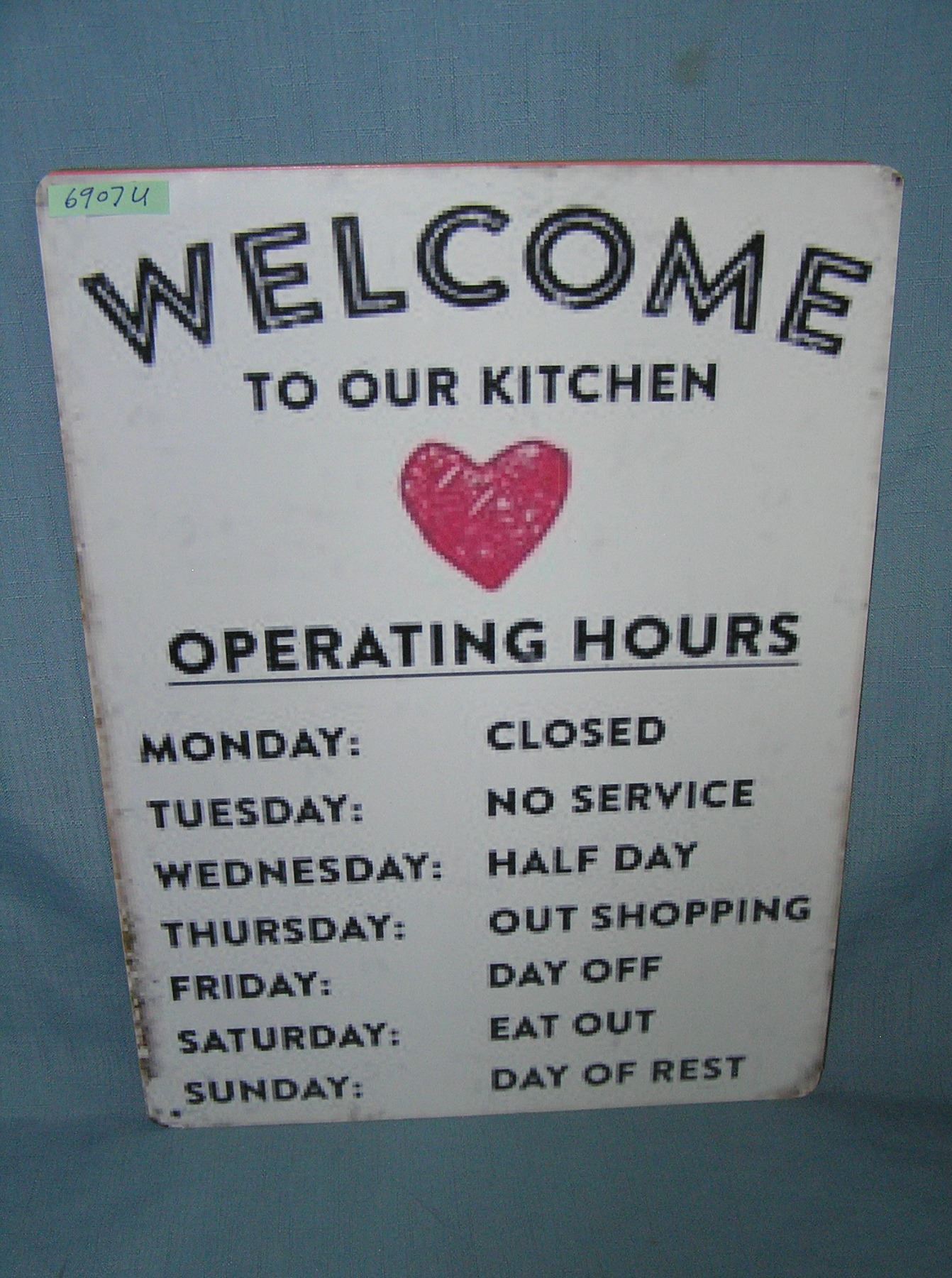 Welcome to our Kitchen retro style advertising sign printed on PVC hardboard these signs are auctioned for their decorative and display purposes 12 inches by 16 inches est. value $40.00-$50.00