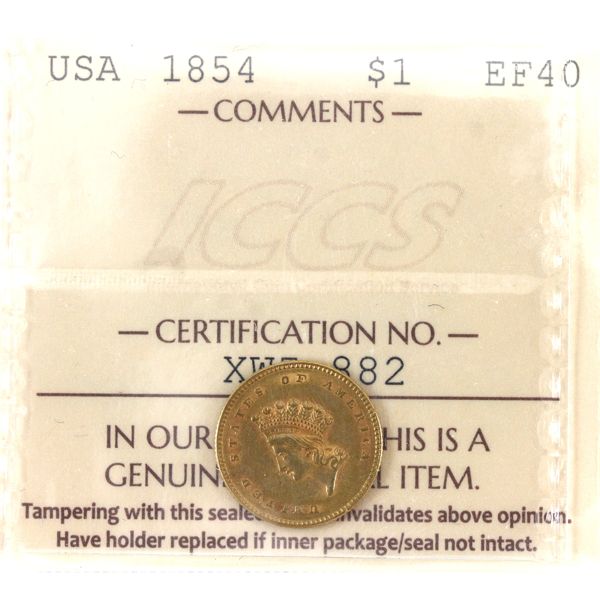 USA Gold 1854 Dollar Type 2, Small Indian Princess Head, ICCS EF40