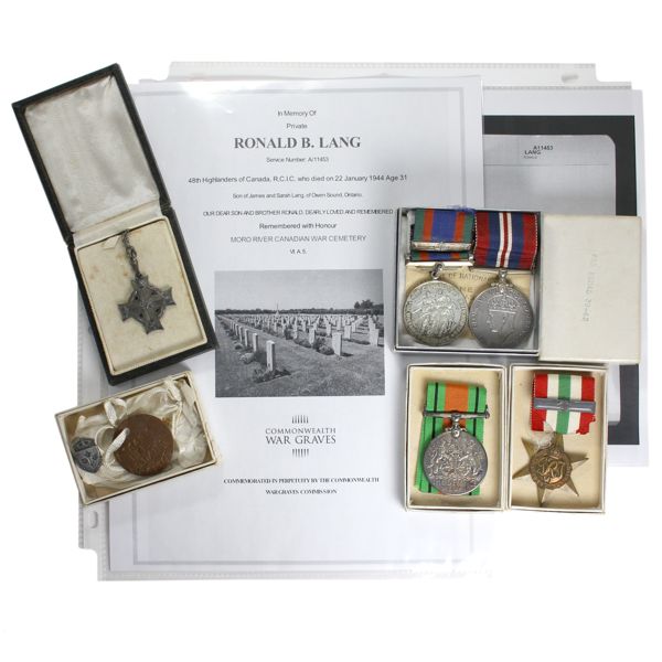 Canada 1939-1945 WWII Medals with Ribbons & Original Boxes, Pin, & Dog Tag, Most ISSUED TO- A11453 Pte Ronald Bell Lang. 48th Highlanders RC...