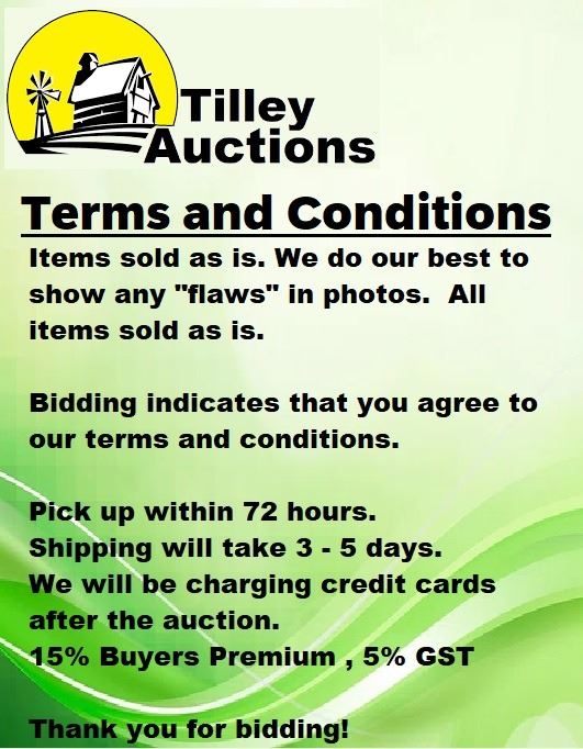 Shipping to Canada and the US. The total shipping costs will be calculated after the auction ends. Combined shipping will apply if the bidder wins more than one asset. The buyer is responsible to pay all shipping charges. Pay by etransfer to Payments@tilleyauctions.com with password auction