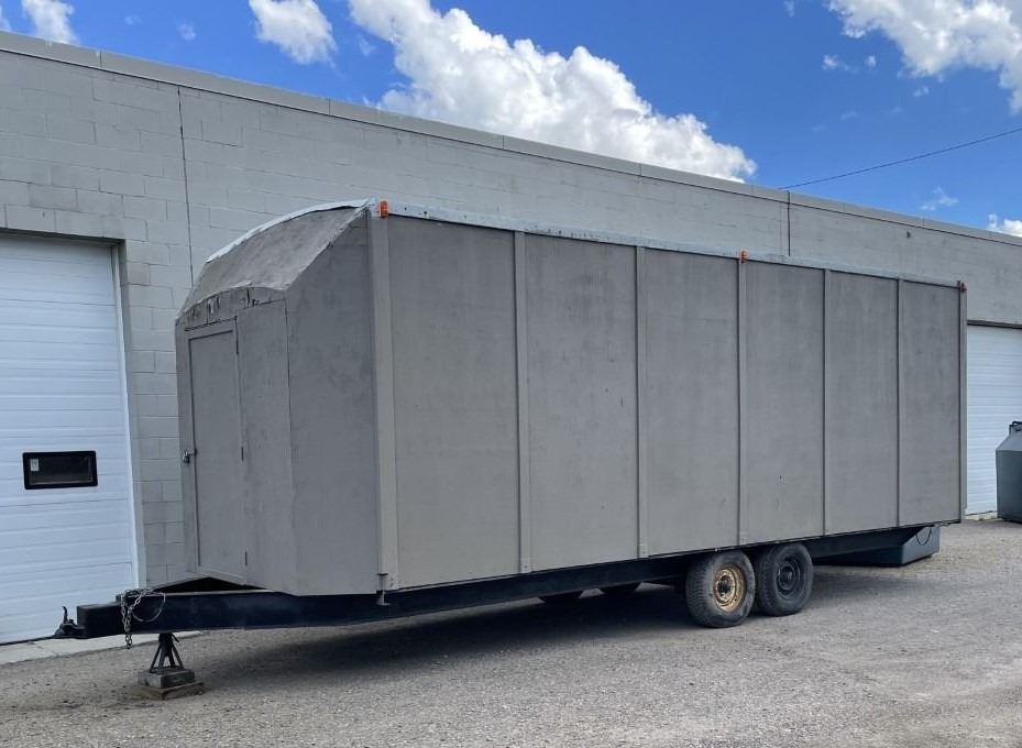 This item is lot 200 in this evening's auction! Custom made trailer for hauling large loads. Perfect if you have a business that needs the flexibility of moving around. It has some built in work benches inside. Wooden sides, multiple loading doors.