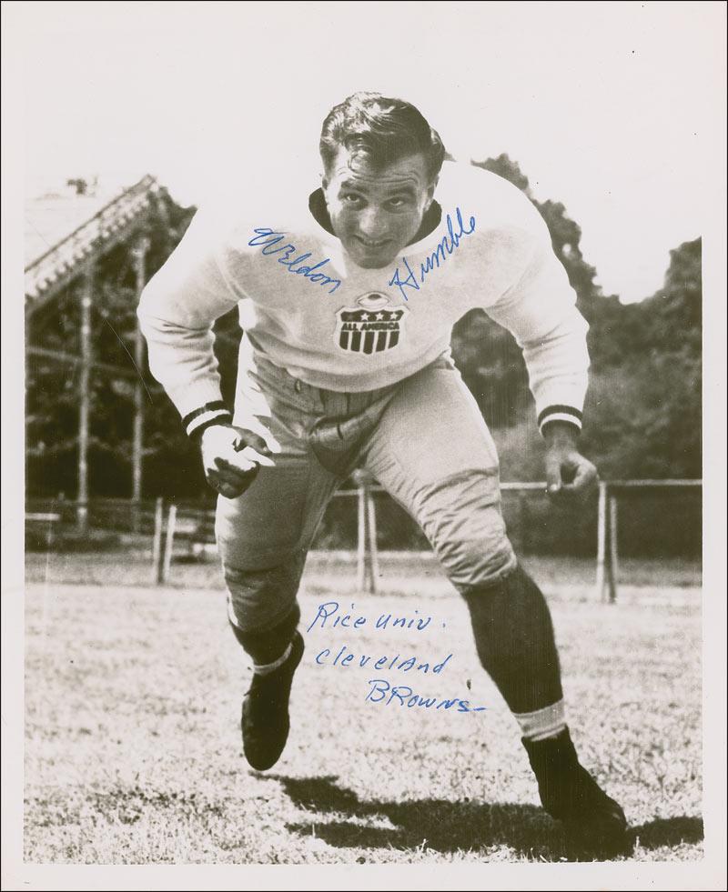 College Football Hall of Famer (1921-1998) who also received the Bronze Star for combat service in Okinawa and Saipan during World War II. Glossy 8 x 10 photo of Humble in his All American uniform, signed in blue ballpoint, “Weldon Humble, Rice Univ. Cleveland Browns.” In fine condition, with mild surface impressions from a letter written on top of the photo.