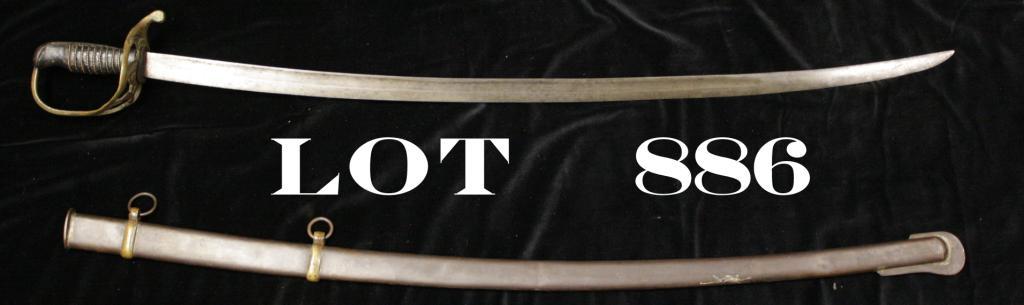 Well-aged older reproduction of a Confederate States Officer’s sword and metal scabbard approx. 44” overall and in fair + to good condition. The blade is unmarked and shows scattered erosion and pin prick pitting, thebrass guard appears sand cast with raised “CSA” initials, wood grip with wire wrapping; the scabbard is metal with integral drag and hanging rings are attached by brass supports. A well-made and good lookingreproduction. Est.: $300-$600.