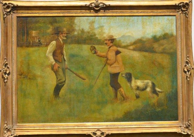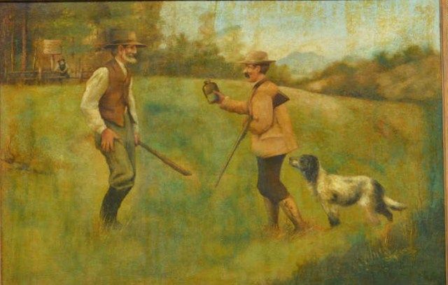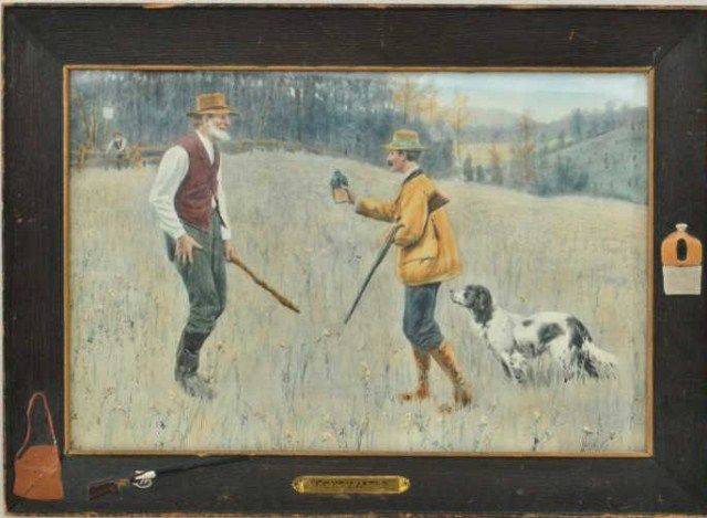 Well-known original oil on canvas attributed to noted American artist A. B. Frost (1851-1928). Measuring approx. 48” by 72” (image). Old period frame, good condition. With original period print of this paintingin humorous period antique frame entitled “Conciliator”. Good condition, measuring approx. 12“ by 18“. From the Robert Petersen Collection. Est: $15,000 - $30,000