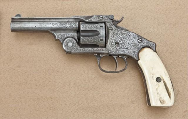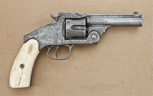 Well-made copy of Smith & Wesson New Model #3, single action revolver, .44 S&W caliber, barrel reduced for 4-1/2”, nicely scroll engraved, bone grips, serial #260 on rear of cylinder with small Belgian proofs. The metal surfaces have been lightly cleaned to grey, show some slight to moderate pinprick pitting, some traces of nickel. The engraving is of good quality. The front sight is crudely made and replaced when barrel was shortened. The trigger and triggerguard are crude Mexican replacements. The grips are loose on the frame and also a Mexican edition. The lanyard is removed. A spike-type firing pin has been added to the hammer. The action and ejector are working. The bore is rough. An interesting old single action that saw service on the borders. Would look great in a Mexican holster. Est: $300 - $600