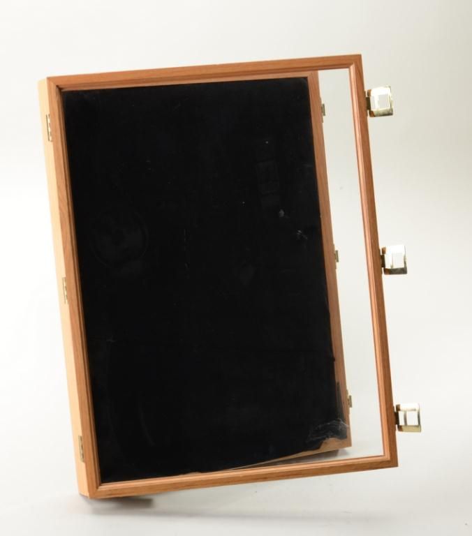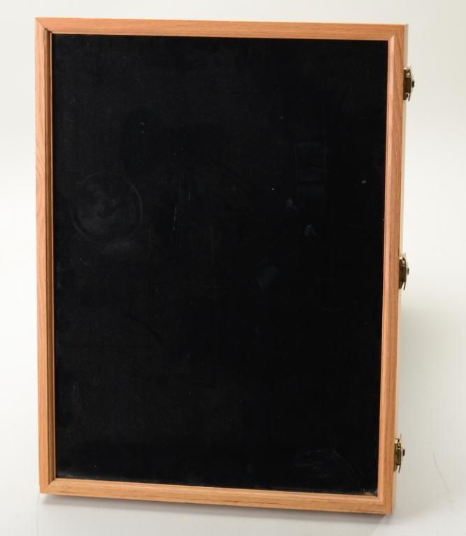 Well-made oak and glass hinged display case approx. 18” x 24” x 2-1/4” with black material covered insert in overall fine condition; great for display of a smalls collection or for the gun show table. Est.: $50-$75.