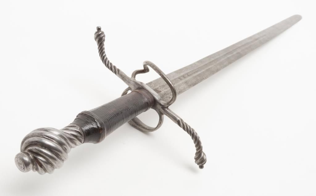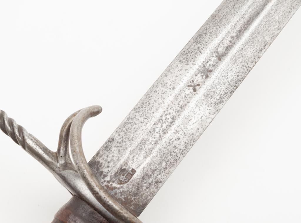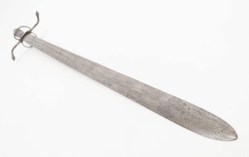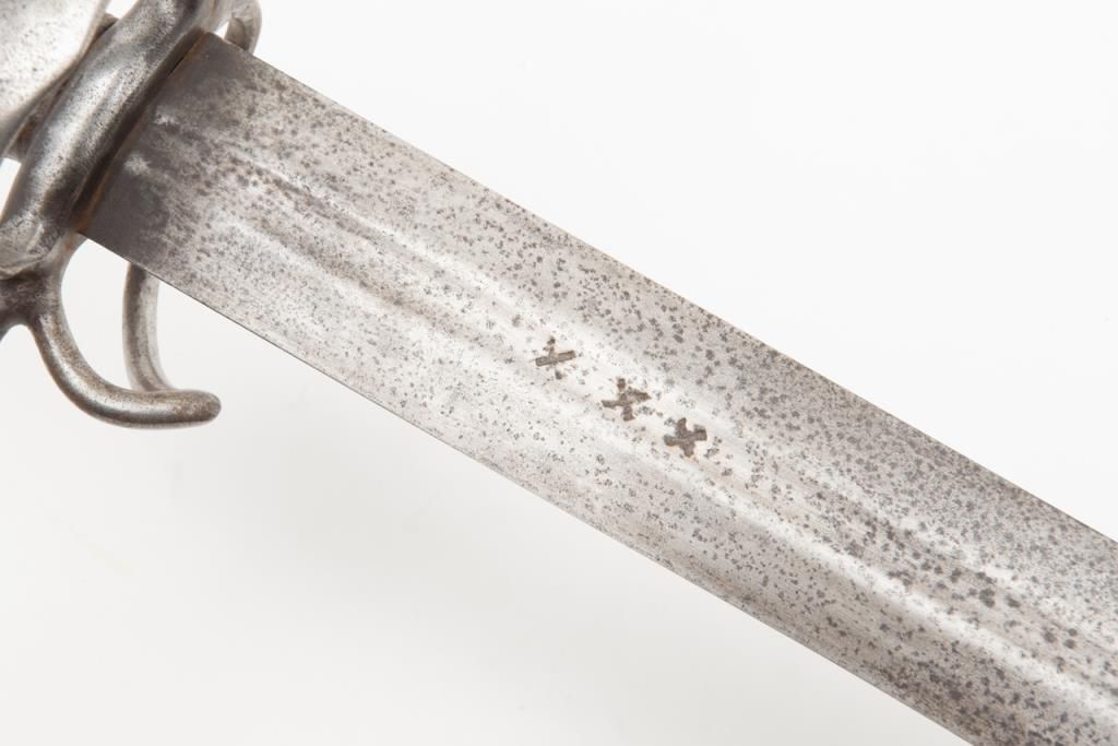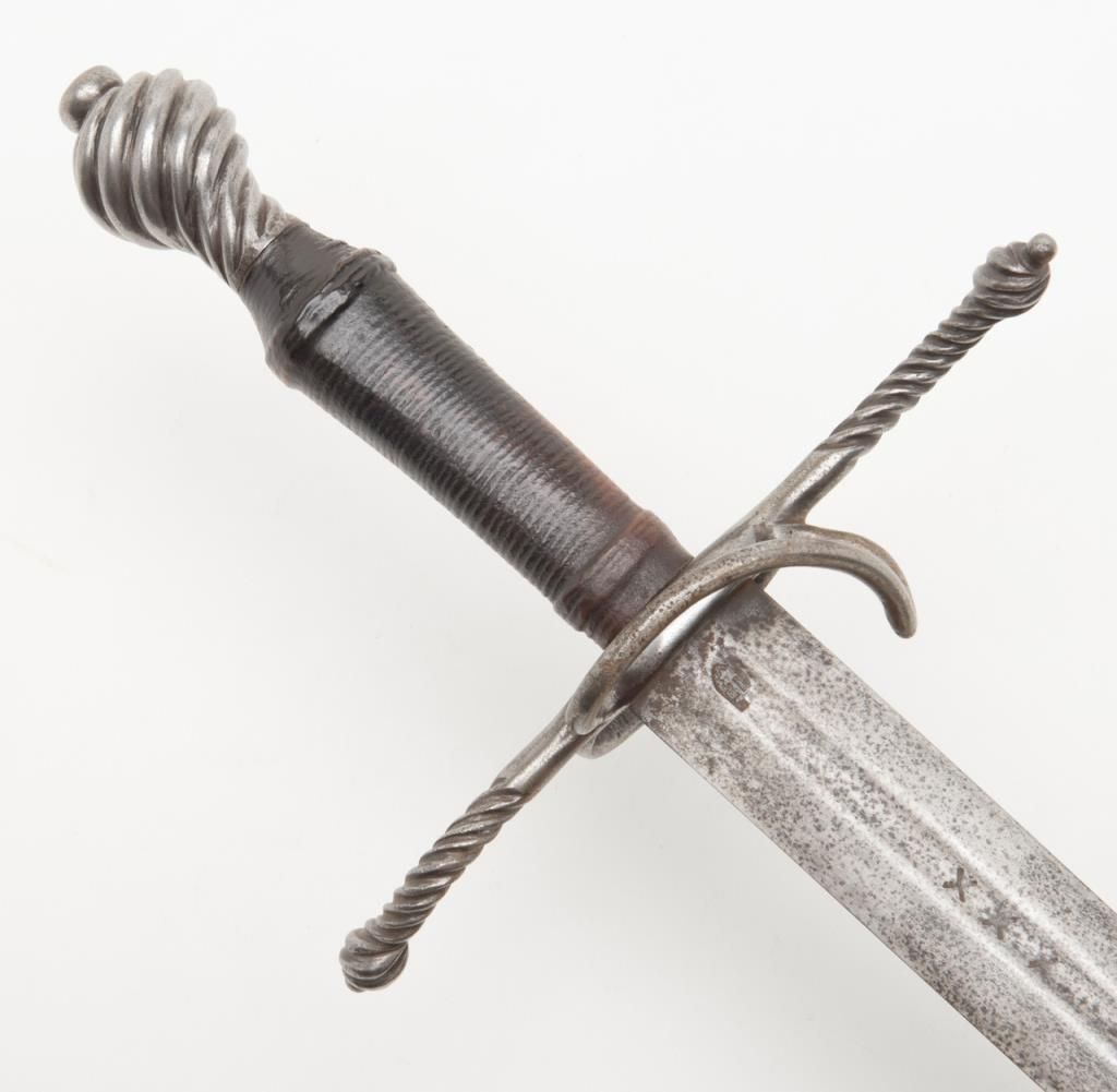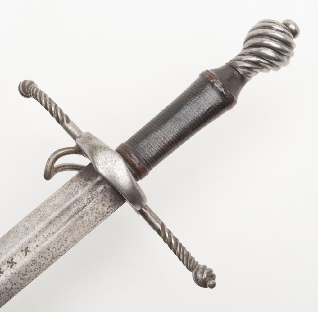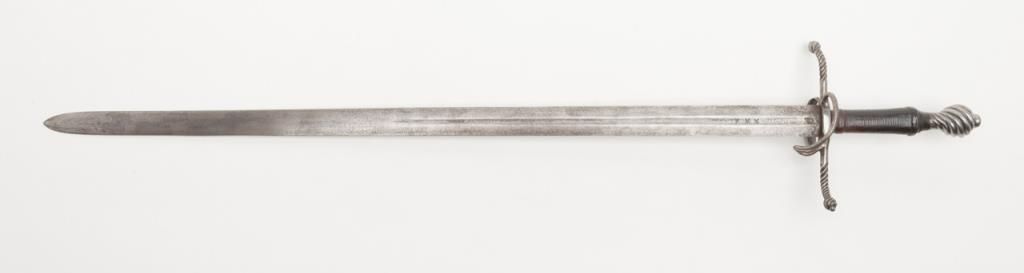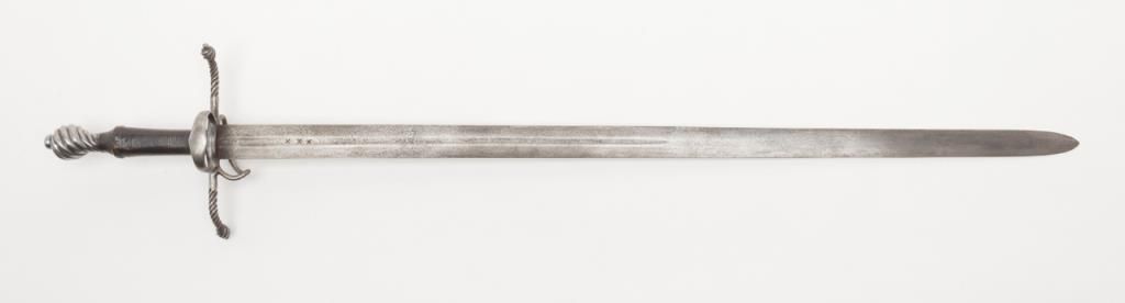 Well-marked early hand and one half broadsword of central European manufacture showing nicely worked hilt and matching pommel with armorer’s type stamping on the blade. The sword measures 44” overall with a 36 ½” blade that is measuringapproximately nearly 1 ½” at the widest part. The blade may have been reduced slightly or tipped during the period of use. The grip is original and the sword does not appear to ever been a part. The guard and blade show some light to moderatepitting. The leather over cord wrapped grip is good. A classic fighting sword that we would date about 1580 to 1620. Est.: $2,500-$5,000