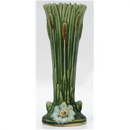 This is a mint condition Weller Ardsley vase, a pattern that was made in the 1920's. Cattails and reeds rise up while the bottom has two water lilies. Stamped on the bottom in blue is Weller Ware and the number 124. No chips, cracks or flaws of any kind mar this stellar piece.