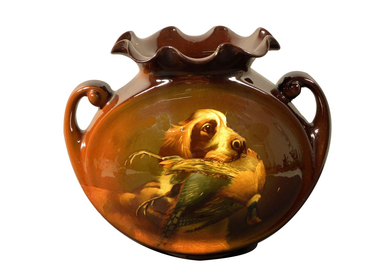 Weller Art Pottery two handled vase. Unmarked and unsigned. Depicting a hunting dog with pheasant. Normal crazing otherwise excellent condition. 11 X 9 X 6 inches.